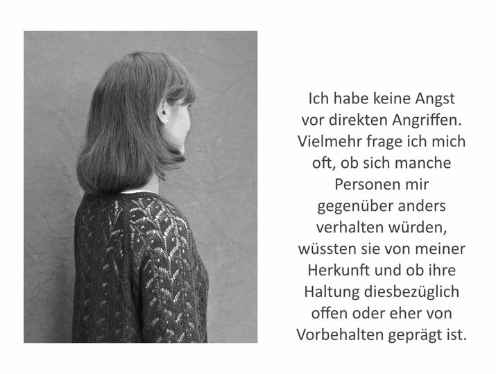 In der Präsenzausstellung sind mehr als 80 Portraitfotos zu sehen. Auf der Homepage wird nur eine Auswahl der Teilnehmer*innen gezeigt. Die grauen Tafeln, auf denen keine Portraitfotos zu sehen sind, stehen für jüdische Menschen, die ihre jüdische Identität oder Herkunft aus Furcht vor möglichen Anfeindungen "im Unsichtbaren" halten wollen. Die Fotos von Menschen jüdischer Herkunft, die in der Ausstellung mit einem Portrait in Vorderansicht vertreten sind, werden zum Schutz ihrer Identität in dieser Reihung nicht gezeigt.